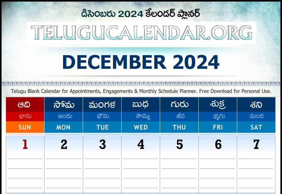 2024 Telugu Calendar Planner December Blank Schedule Planner.
