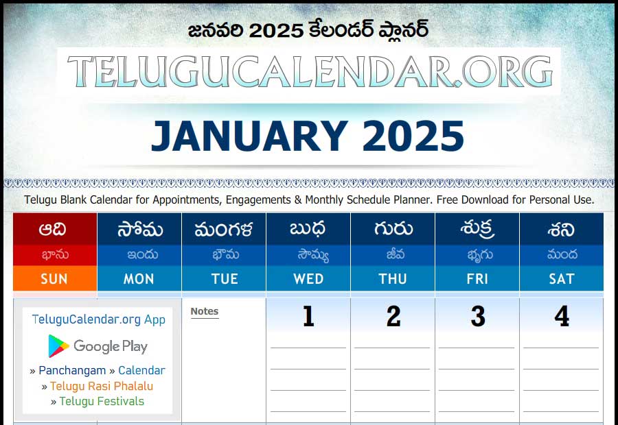 2025 Telugu Calendar Planner January Blank Schedule Planner.