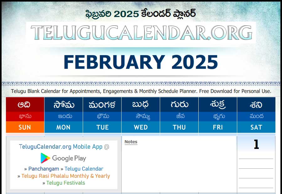 2025 Telugu Calendar Planner February Blank Schedule Planner.