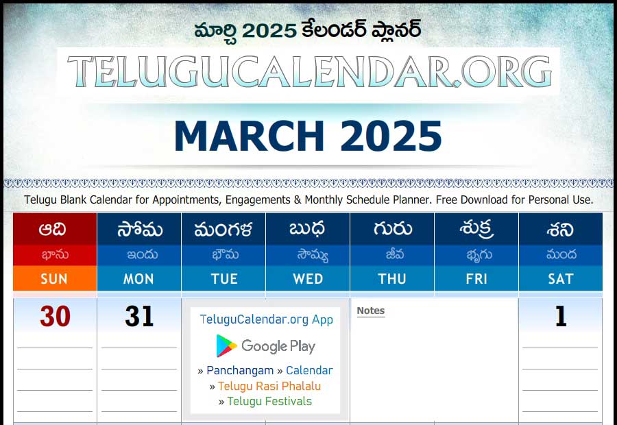 2025 Telugu Calendar Planner March Blank Schedule Planner.