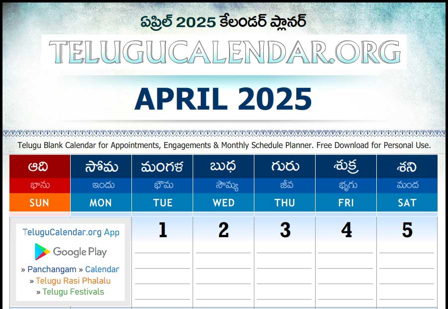 2025 Telugu Calendar Planner April Blank Schedule Planner.