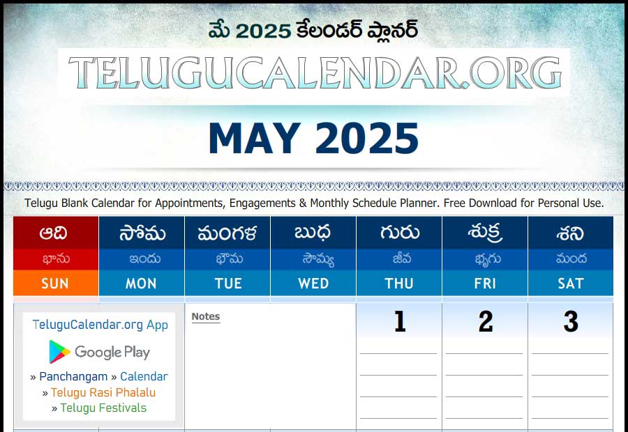 2025 Telugu Calendar Planner May Blank Schedule Planner.