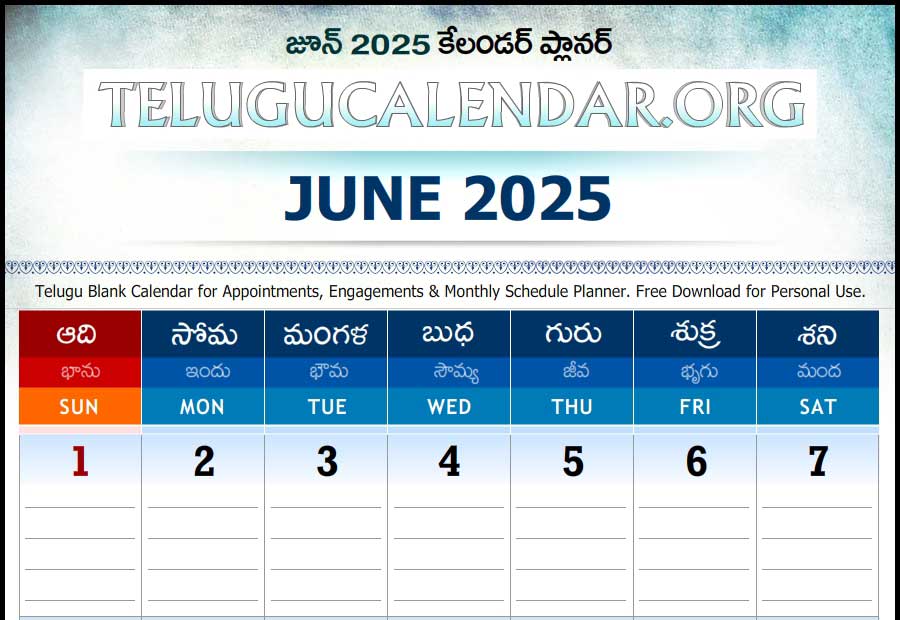 2025 Telugu Calendar Planner June Blank Schedule Planner.