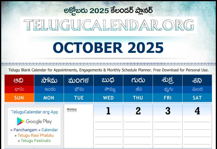 2025 Telugu Calendar Planner October Blank Schedule Planner.