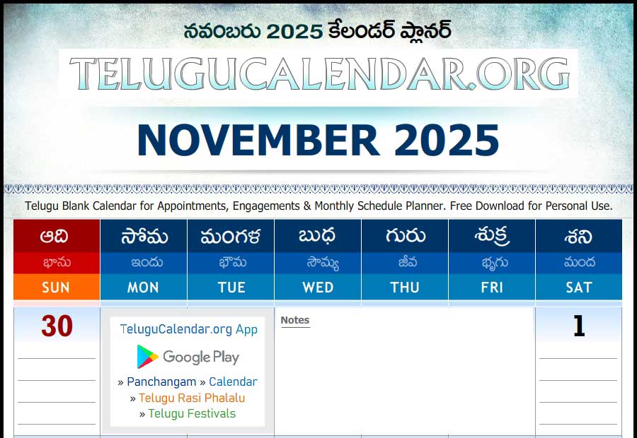 2025 Telugu Calendar Planner November Blank Schedule Planner.